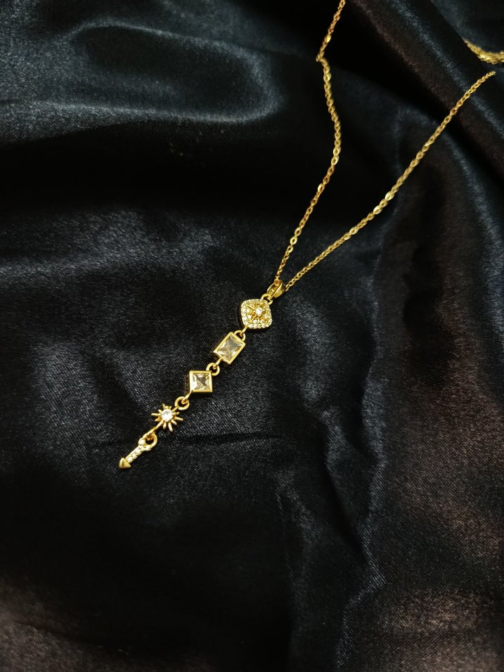 Geometrik şekilli detaylı kolye ucu ve zincir detayıyla altın renk midi uzunlukta, günlük bohem tarzına uygun bir kadın kolyesi. ✨