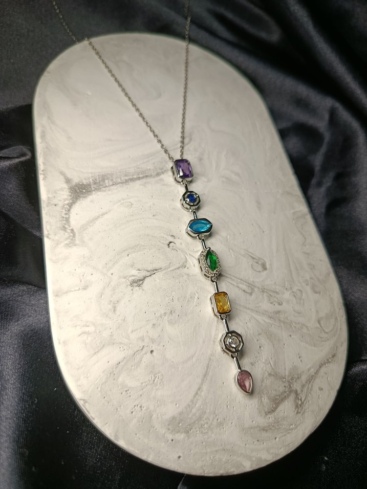 Bohem tarzda, çeşitli renklerde taşlar ve detaylı zincire sahip uzun kolye, günlük kullanıma uygun.