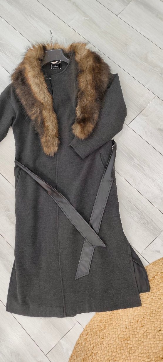 Kahverengi kaban, yumuşak kürklü yaka ve belden deri bağcıklı tasarıma sahiptir. Uzun kollu ve yan ceplidir. Hiçbir deformasyonu yoktur kalıbı geniş olduğundan satıyorum... kürkünü ben ekledim ancak satın alacak kişiye hediye edeceğim
