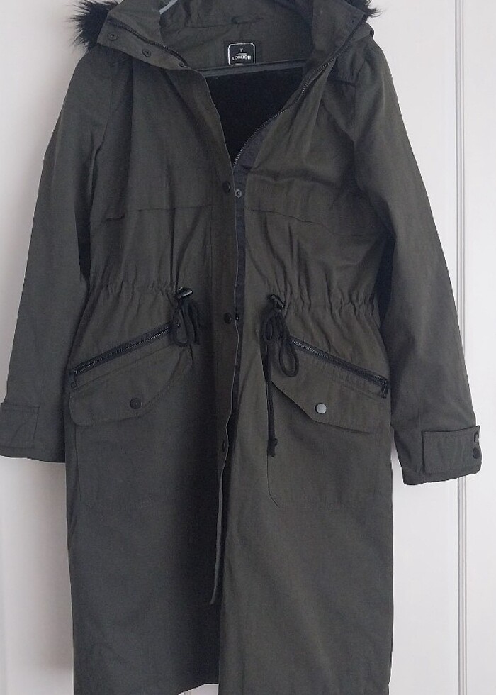 3 kere giyildi.cok temiz koyu haki renk parka.36 beden yazıyor fakat m beden uyumludur