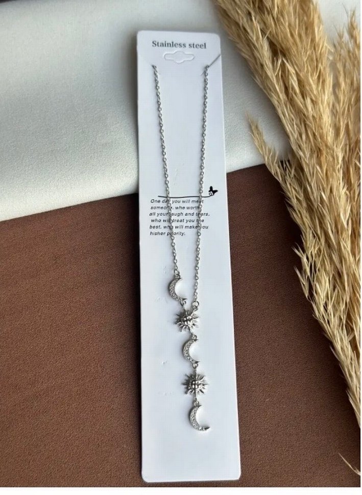 Parlak, uzun zincirli bu kolye, ay ve güneş figürlü detaylı zincirden oluşur. Paslanmaz çelikten yapılmıştır, bohem ve minimalist tarzlara uygundur.