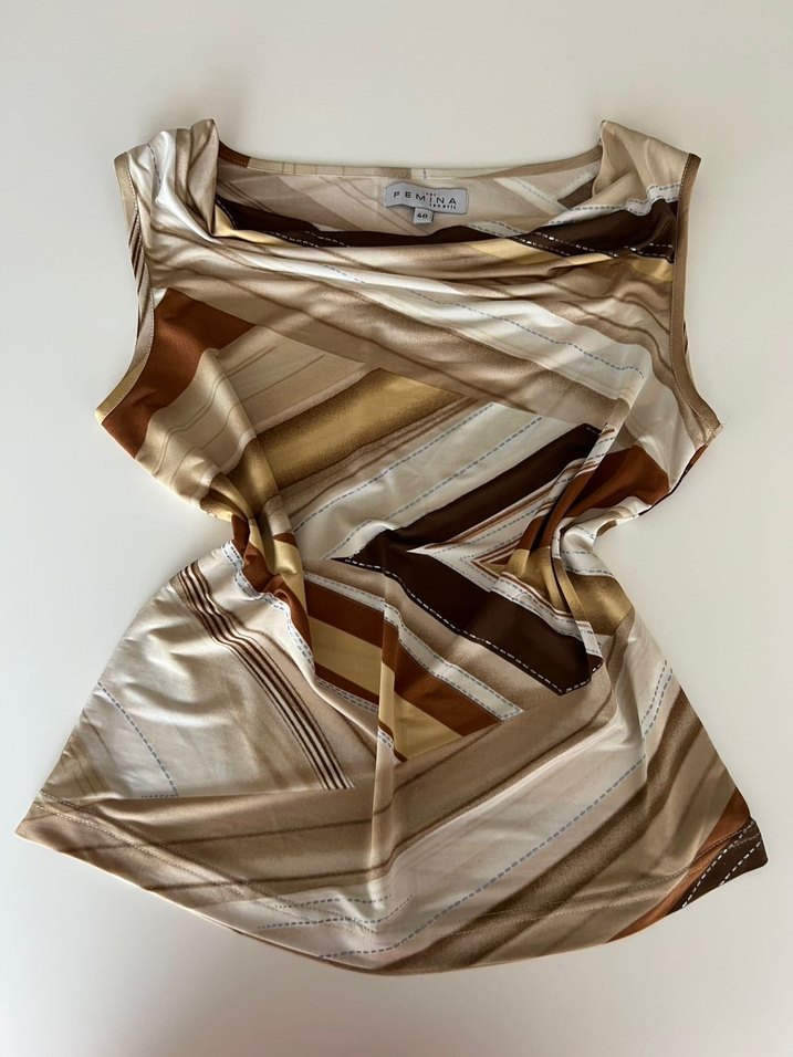 Bej tonlarında desenli, parlak ve drapeli tasarıma sahip, ince ve kolsuz, tekne yaka kadın bluz. Ofis kullanımı için uygun, şık ve modern.