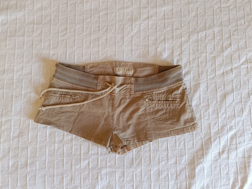 Bej renkli, keten kumaştan kemerli ve dar kesim mini şort. düşük bel
