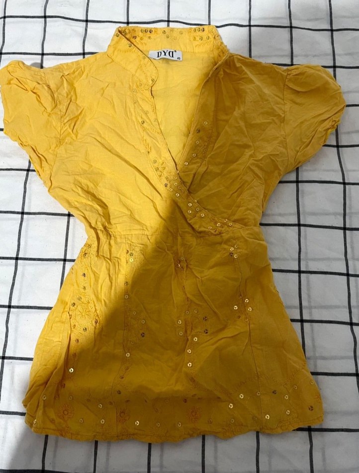 Sarı, kısa kollu, V yaka ve oturan kesim hamile bluzu. Keten kumaştan, drapeli ve parlak payet detaylı, dış mekan kullanımı için uygun. Marka: DYT.