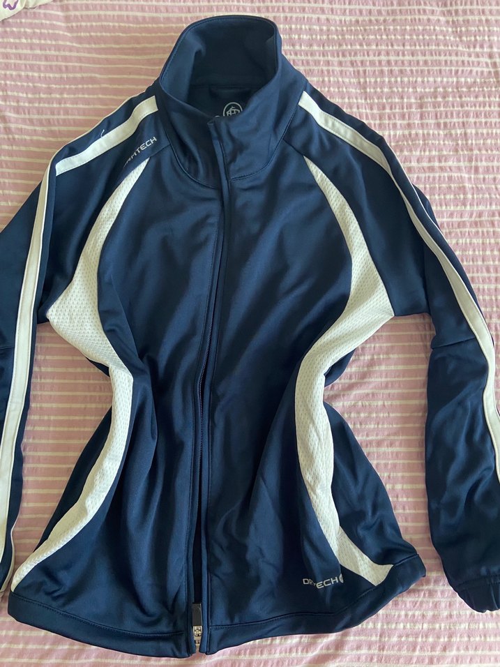 Parlak mavi sentetik kumaştan, yüksek yakalı ve fermuarlı, uzun kollu, vücuda oturan kadın ceket. Yanlarda beyaz paneller bulunur, sportif ve günlük kullanıma uygundur.