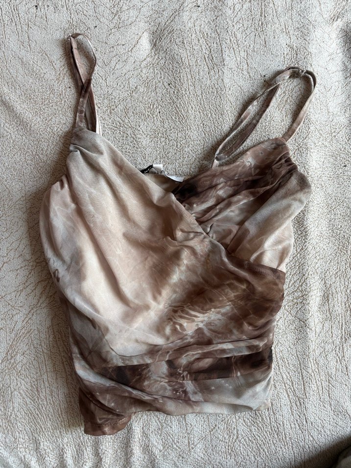 Keten kumaştan, bej ve gri batik desenli, drapeli askılı bluz. Straplez yakalı, vücuda oturan kesimiyle bohem tarzda, günlük kullanıma uygun.