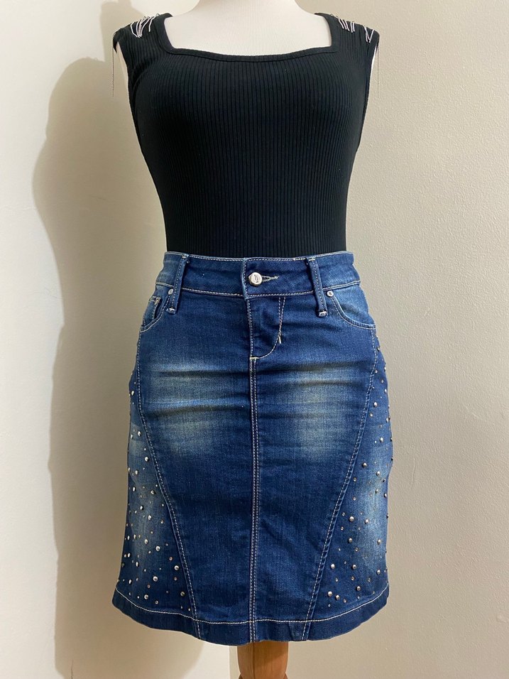 Mavi denimden yapılmış, işlemeli ve payetli, vücuda oturan mini etek. Günlük kullanıma uygun, şık bir sokak stili ürünü. 38 bedendir. Herhangi bir defosu yoktur. Alana hayırlı olsun. ✨