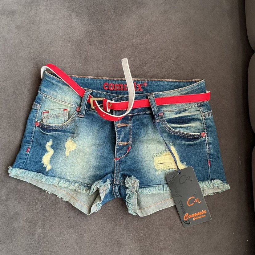 Yıpranmış detaylı ve baskılı, tokalı kırmızı kemerli dar kesim kot şort. Açık hava için uygun, rahat bir tasarım.