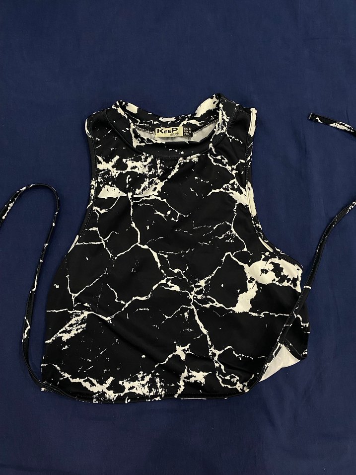 Kolsuz, yüksek yakalı ve vücuda oturan kesime sahip kadın bluz. Siyah-beyaz batik desenli ve dantel detaylı, sentetik kumaştan üretilmiştir. Günlük kullanım için uygundur.