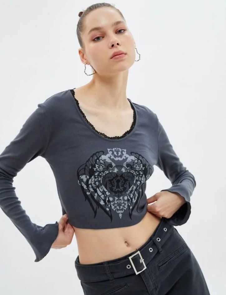 Dantel detaylı V yaka, uzun kollu, gri bluz. Gotik baskılı trend bir görünüm sunar. Y2k grunge tarzı gri bluz hediye geldi hiç kullanılmadı