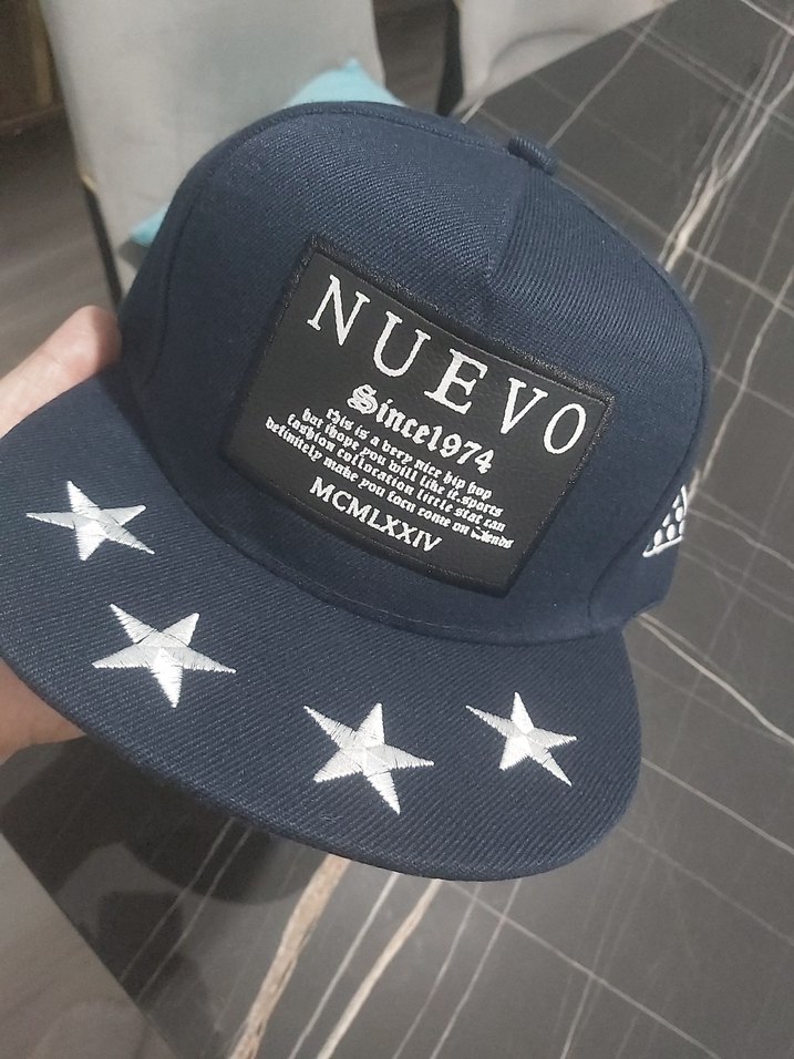 Koyu mavi renkte, yıldız desenli ve üzerinde 'NUEVO, Since1974, MCMLXXIV' yazılı yama bulunan street style erkek şapka. Rahat ve trend görünüm sağlar.