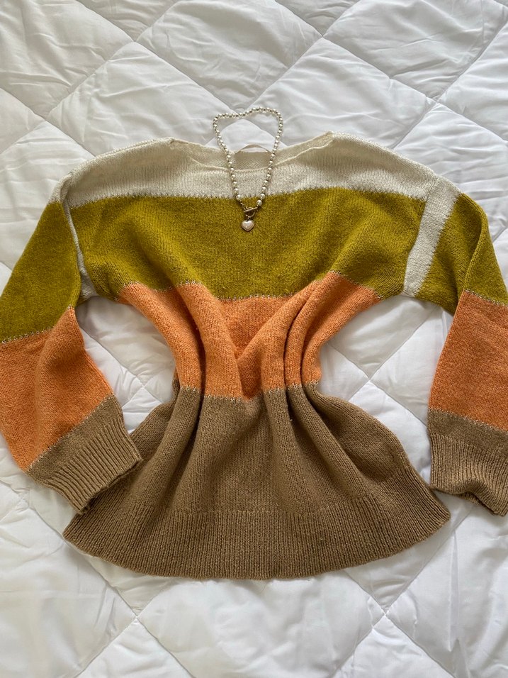 Kadınlar için çok renkli, hafif çizgili, bol kesim ve yuvarlak yakalı triko kazak. Yumuşak örgüden yapılmış, bohem tarzında ve günlük kullanıma uygun.