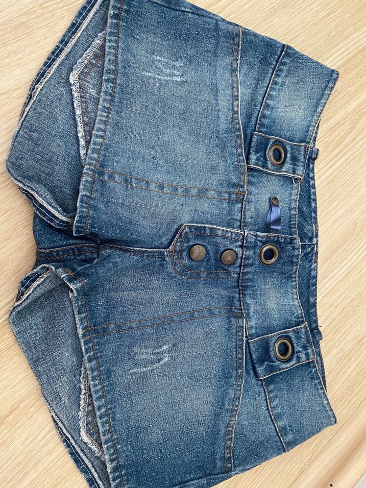 Y2k mini şort Düğmeli, fitted kesim mavi mini jean şort. Parlak dokusu günlük sokak stiline uygundur.