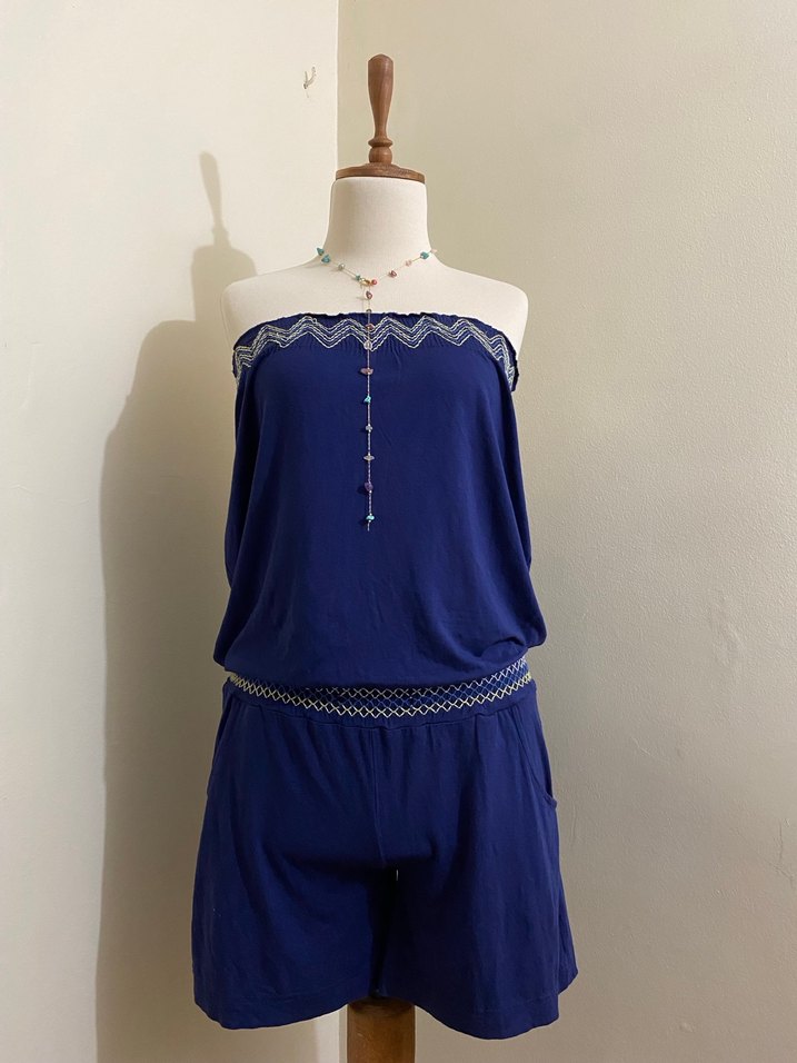 Nakış detaylı, yumuşak örme kumaştan yapılmış, straplez, kısa ve bol kesim mor tulum. S bedendir ama M-L beden için daha iyi olur. Alana hayırlı olsun. ✨