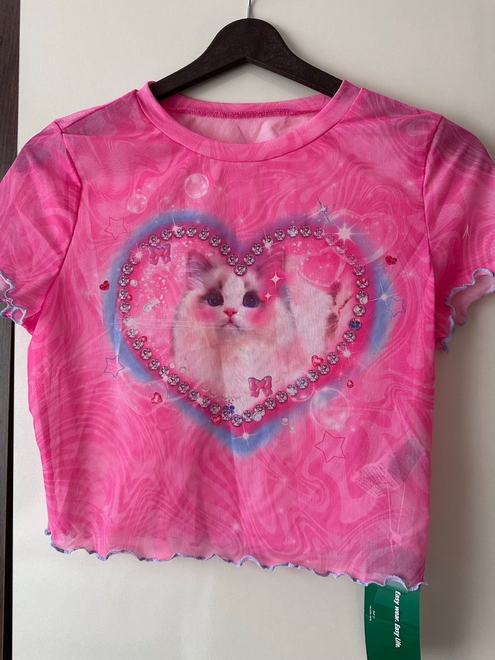 Dantelli kenarları ve kalp şeklinde kedi baskısı olan pastel pembe tie-dye kedi tişörtü, street wear tarzında. Yurtdışından alındı.