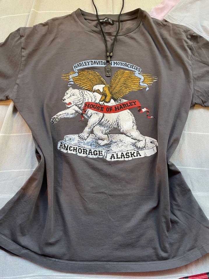 Gri renkli, baskılı, kısa kollu, yuvarlak yakalı, bol kesim. Harley davidson t shirt