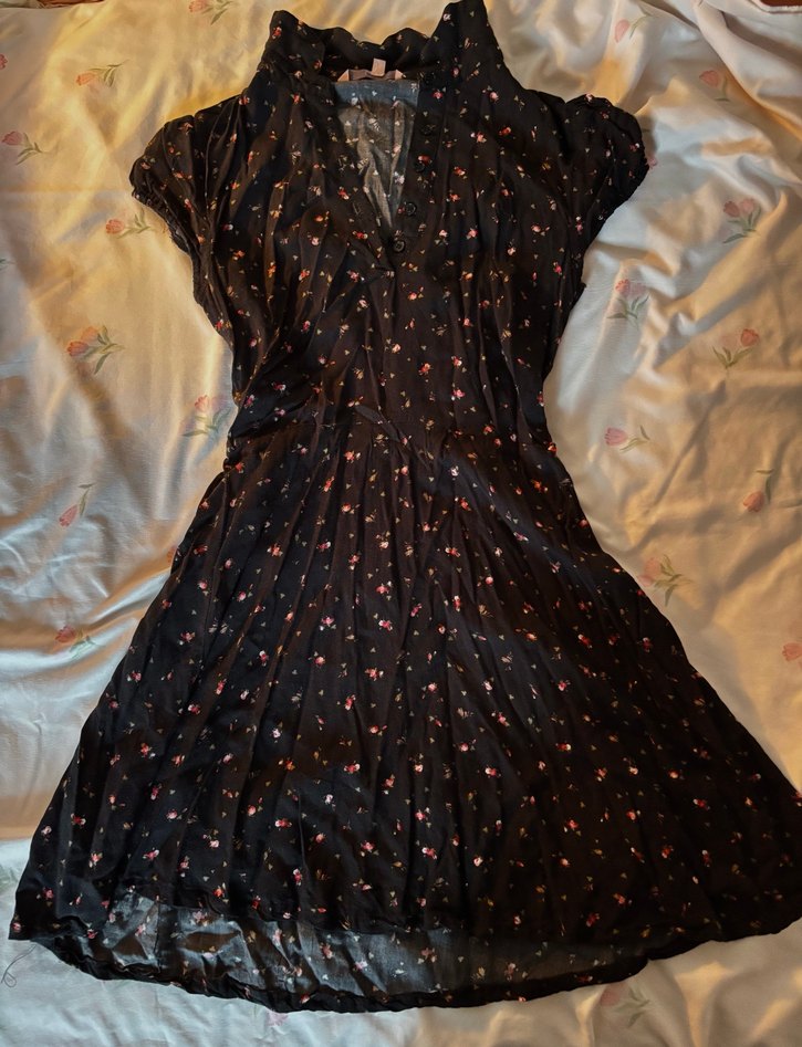 V yaka, kısa kollu, drapeli ve çiçek desenli siyah mini elbise. Yumuşak sentetik kumaştan, y2k tarzda. Bir kolunda hafif potluk var ama belli olmuyor son fotoğrafa ekledim. 34 beden.