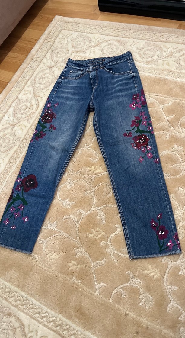 Koyu mavi denim kot pantolon, nakışlı çiçek desenleri ve boncuk detaylarıyla. Bohem tarz ve sokak modasına uygun, bol kesim midi boy, romantik buluşmalar için ideal.