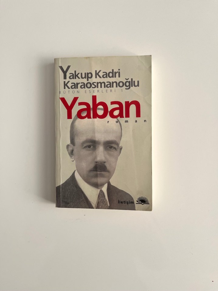 "Yaban" romanı, siyah-beyaz kapak ve bir adamın portresini içerir. Türk edebiyatının klasik eserlerinden biridir.