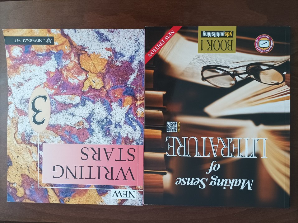 writing ve reading kitabı writing kitabı hiç çözülmedi reading kitabının bazı sayfaları dolu İki yabancı dil kitabı var: renkli soyut kapaklı "Writing Stars" ve kitaplar ile gözlük fotoğraflı "The Senses of Nature".