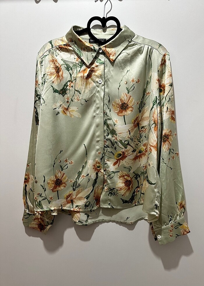 Yağ Yeşili Çiçekli Saten Gömlek