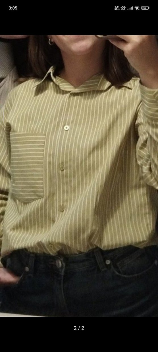 yağ yeşili renkli ve dikey çizgili, düğmeli, yakalı ve uzun kollu bol kesim kadın gömleği. Günlük sokak stili için uygun.