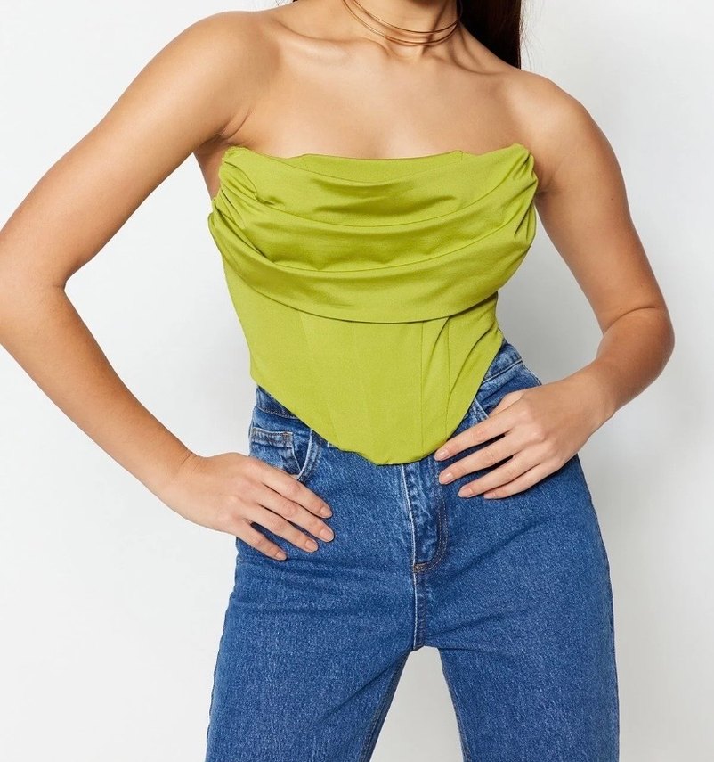 Yeşil renkte, drapeli ve vücuda oturan straplez bustiyer. Sentetik kumaştan. Kolsuz ve desensiz, günlük sokak stiline uygundur.