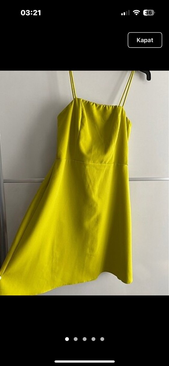 Bu sarı midi elbise, drapeli straplez yaka ve kolsuz tasarımı ile şık bir görünüme sahiptir. Parlak kumaşı günlük kullanım için uygundur.