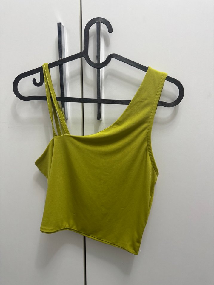 Yumuşak sentetik kumaştan, drapeli ve tek omuzlu yağ yeşili crop atlet. Sokak modası ve günlük kullanım için uygun. Etiketi yok hiç giyilmedi