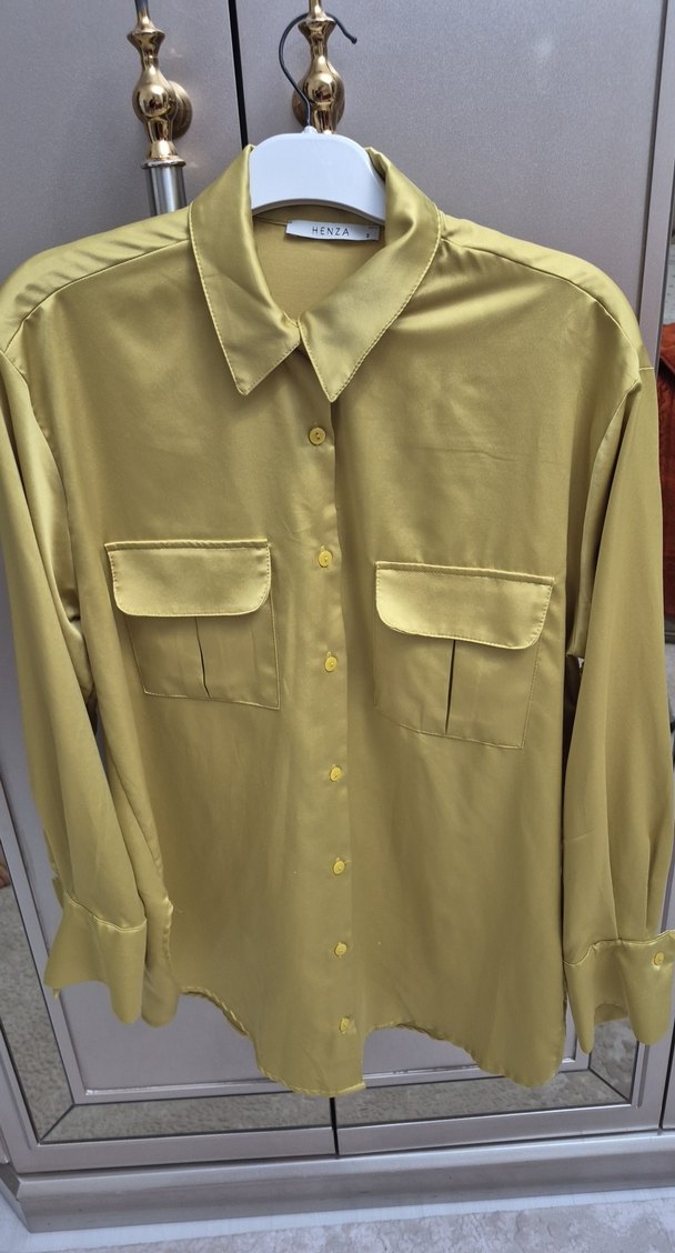 yağ yeşili, parlak saten kumaştan yapılmış, düğmeli ön ve kırlangıç yaka detaylı uzun kollu, bol kesim kadın gömleği. Rahat ve şık, günlük ya da ofis kullanımına uygun. ✨