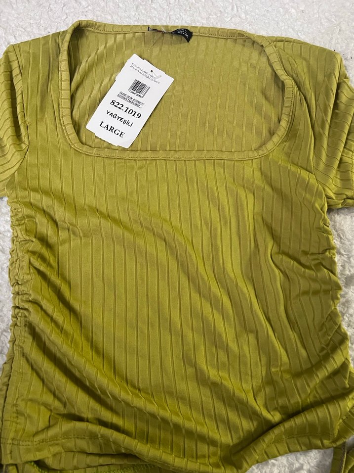 Yağ yeşilidir.Kenarları büzgülüdür kare yakadır.Hiç kullanılmadı ter temiz.L beden