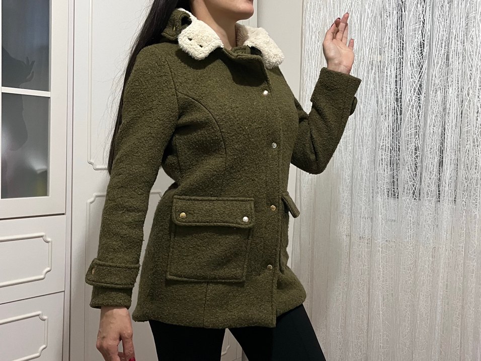 Yağ yeşili kaşe tüy detaylı yakaya ve uzun kollara sahiptir. Yumuşak ve sıcak kumaştan S beden bir kaç kere giyilmiştir tarzım olmadığı için satıyorum