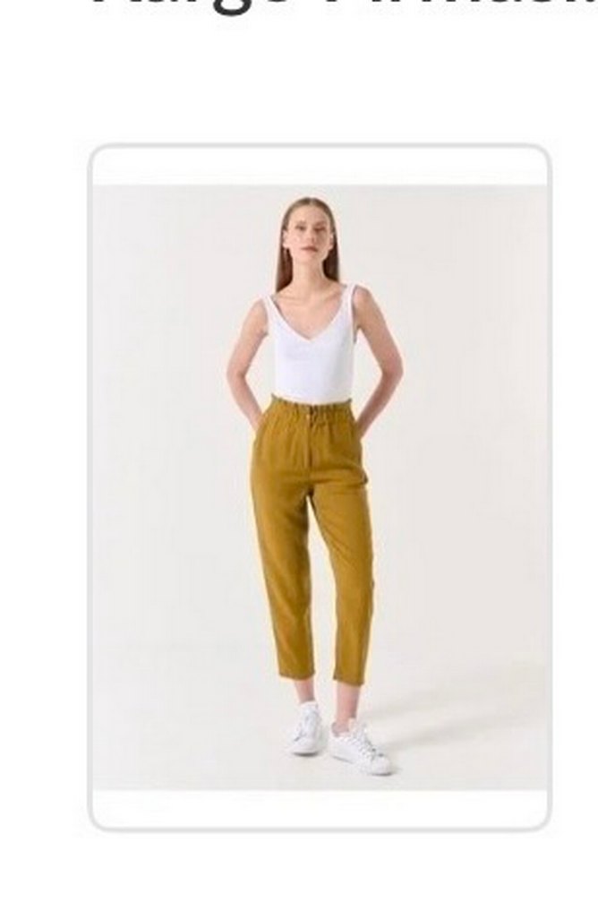 Yağ yeşili keten kumaştan, rahat kesim ve normal midi boy pantolon. Günlük kullanım için şık ve rahat bir tercih.