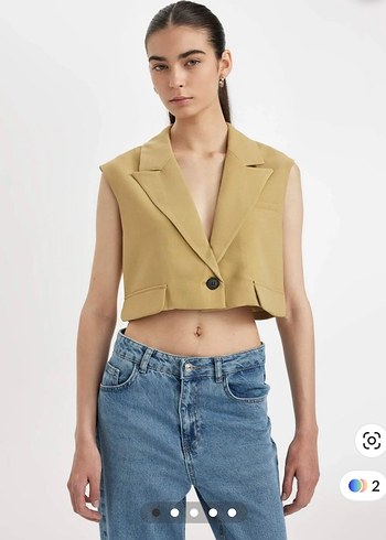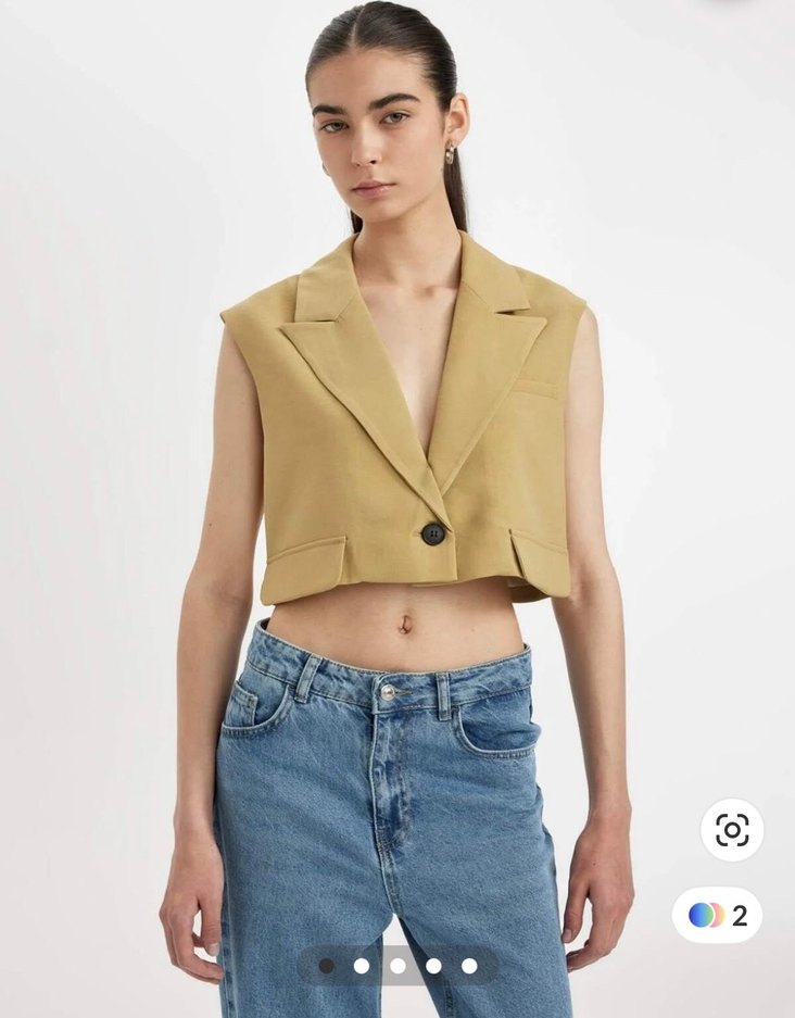 yağ yeşili kolsuz blazer kesik yaka ve düğmeli, crop blazer yelek Sadece 1 kere düğünde giyildi. Defosu yok sadece ütü gerekiyor