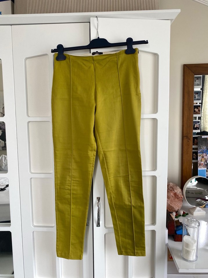 Yağ yeşili , regular fit, kemerli kadın pantolonu, parlak sentetik kumaştan. Ofis kullanımı için uygun, sade ve şık görünümlü.