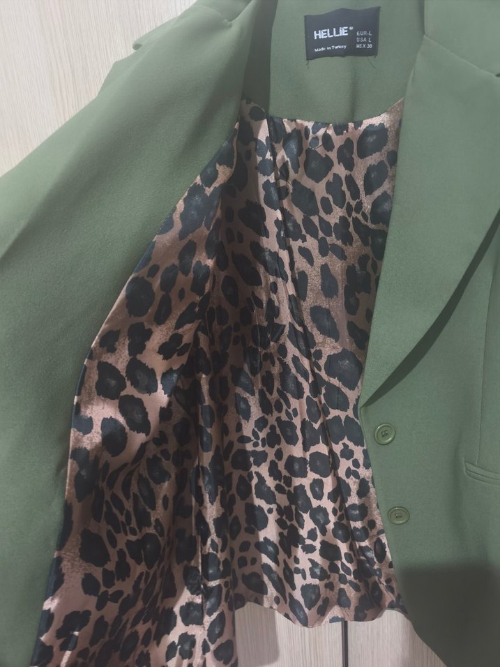 Düğmeli, yakalı ve leopar desenli, parlak yeşil renkte uzun kesim kadın blazer. İç kısmı leopar desenli astarlı, regular fit ve kolsuz tasarıma sahiptir.