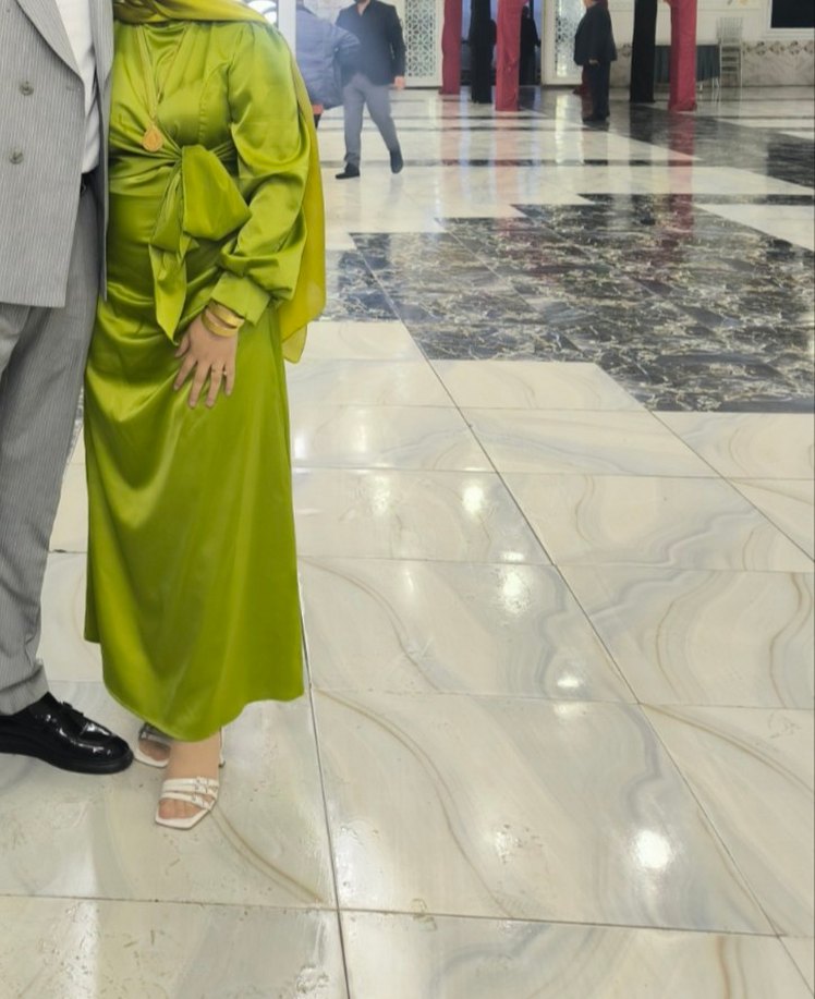 yağ yeşili Parlak Uzun Drapeli Kadın abiye - Görsel 1