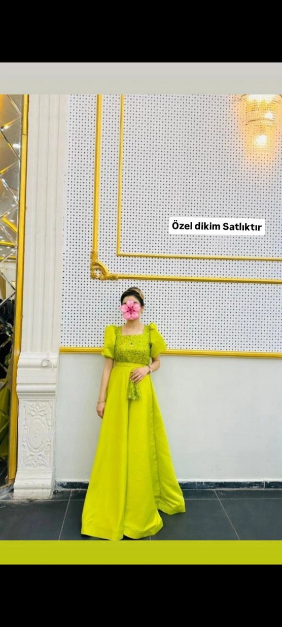 Sarı renkli, tekne yaka ve ince askılı, nakış işlemeli, drapeli uzun kadın abiyesi. Regular kesim ve özel dikimdir.