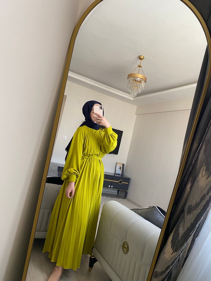 Yağ yeşili Piliseli Uzun Kadın Elbise