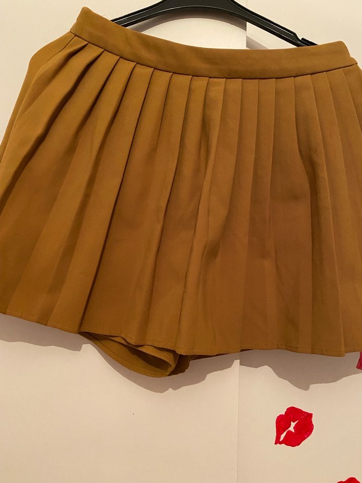 Yağ yeşili renk, pliseli tasarıma sahip, bol kesim ve parlak görünümlü mini şort etek. Sentetik kumaştan, sokak modasına uygun.