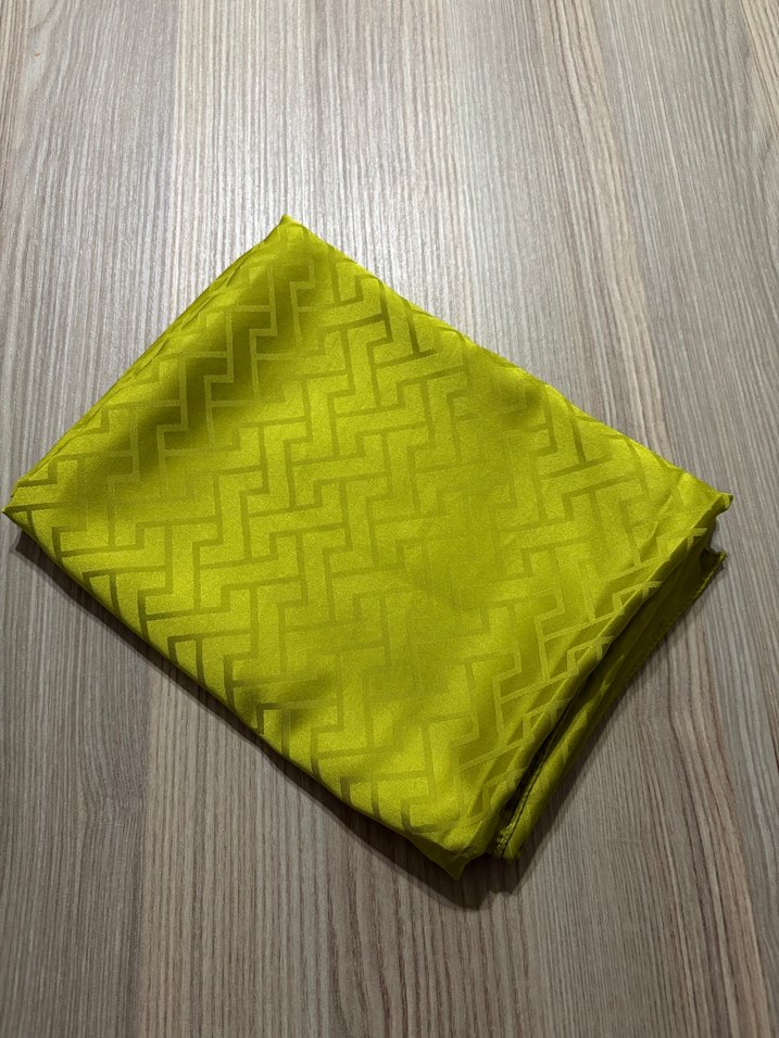 Parlak sarı renkte, pileli tasarıma sahip kadın şal, çağdaş ve minimalist bir stil sunar. Yağ yeşili rengi. 1 kez kullanıldı defosu yoktur