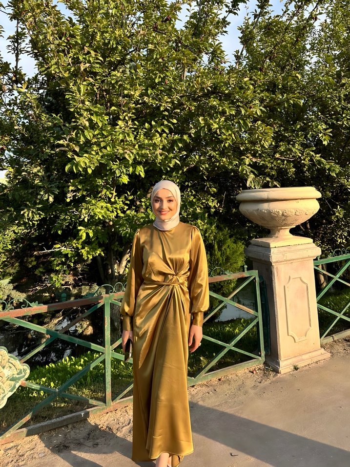 Altın renginde, uzun kollu ve yüksek yakalı, drapeli detaylı kadın elbisesi. İpeksi saten kumaştan, düz kesim ve parlak etnik desenlidir. Düğün için uygundur. manken boy:160 manken kilo:50-60 kilo arasi uygundur