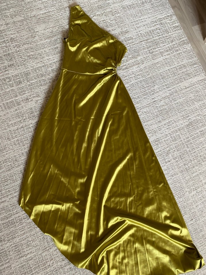 Yağ Yeşili Saten Elbise Tek Omuzlu Pileli