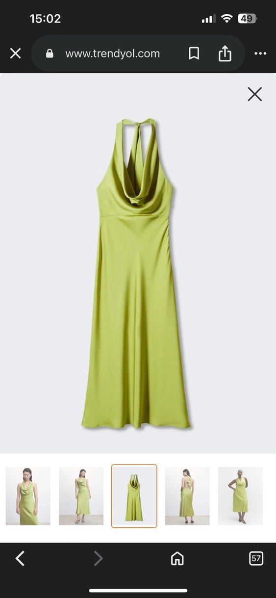 Yeşil, saten dokulu, uzun ve kolsuz elbise, V yakalı ve drapeli tasarıma sahiptir. Romantik akşamlar için ideal, parlak ve sade şık görünüm sunar.