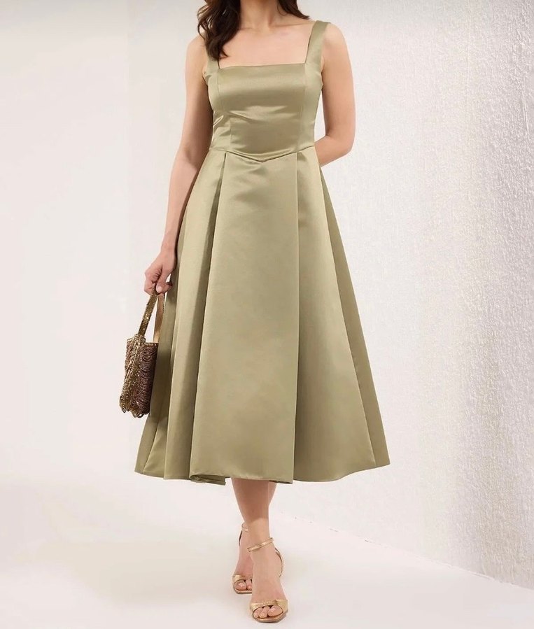 Yağ Yeşil renkli, uzun abiye elbise straplez yaka ve pile detayına sahiptir. Düzenli kesim ve ince askılı kollara sahiptir, düğünler için uygundur.