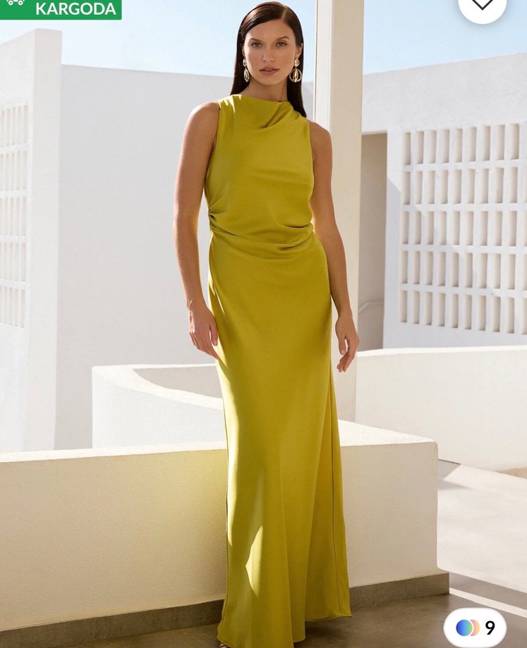 Yağ yeşili renkte, uzun ve drapeli kesime sahip kadın elbisesi. Yüksek yakalı, kolsuz ve ipeksi kumaştan üretilmiştir. Düğün ve özel günler için uygundur. Parlak ve desensiz yapısı çağdaş bir zarafet sunar.