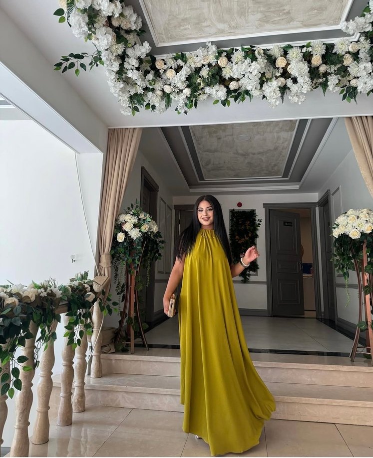 Yağ yeşili uzun, yüksek yakalı ve kolsuz, dökümlü ve bol kesim ipeksi kumaştan yapılmış kadın elbisesi, gösterişli davetler için uygundur. Özel dikimimdir astar gerekmiyor çok rahat her beden rahatlıkla tercih edilebilir