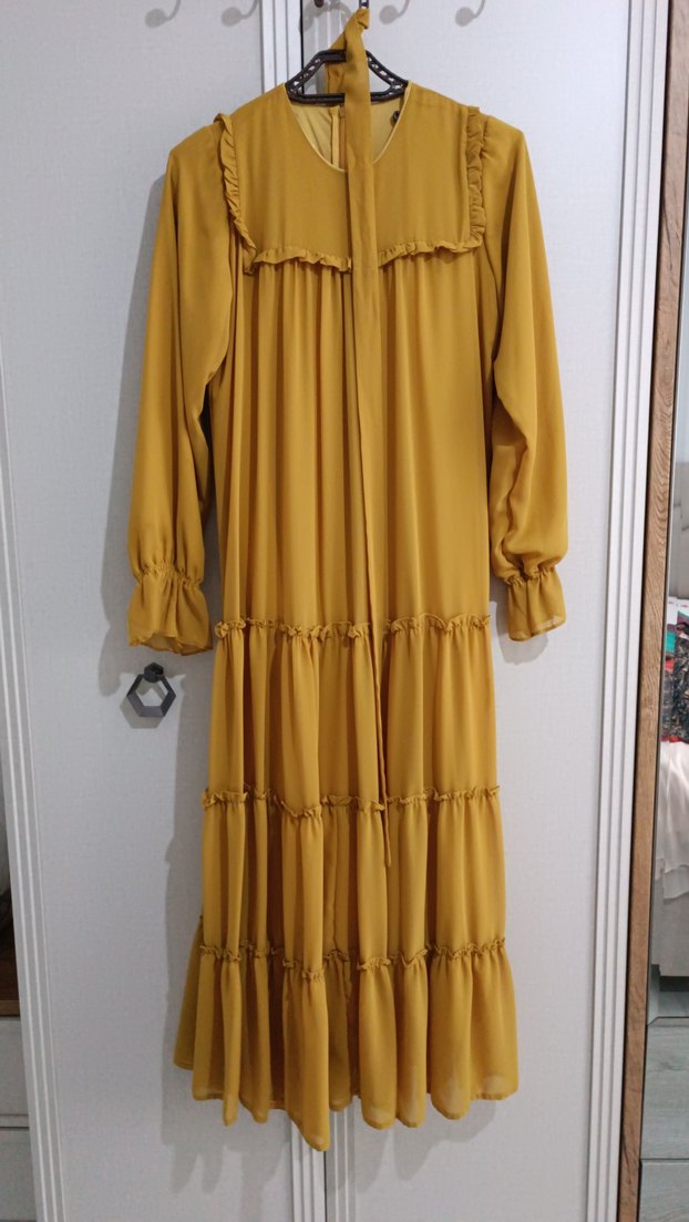 Yağ yeşili renk, göğüsten önden ve arkadan robalıdır. Volan detaylı, bol kesim ve parlak görünümlü. Tam boy ve desen içermeyen tasarım. son kumaştır astarlıdır kendinden seyyar kemeri vardır 40 bedendir. iki kere falan giyildi temizdir