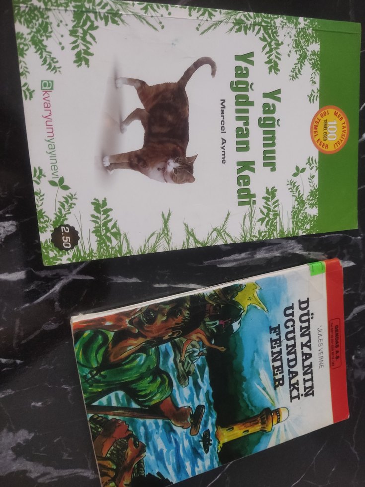 Yağdıran Kedi ve Dünyanın Fener Ucundaki çocuk kitapları, biri kedi resmi, diğeri deniz ve fener çizimi ile.
