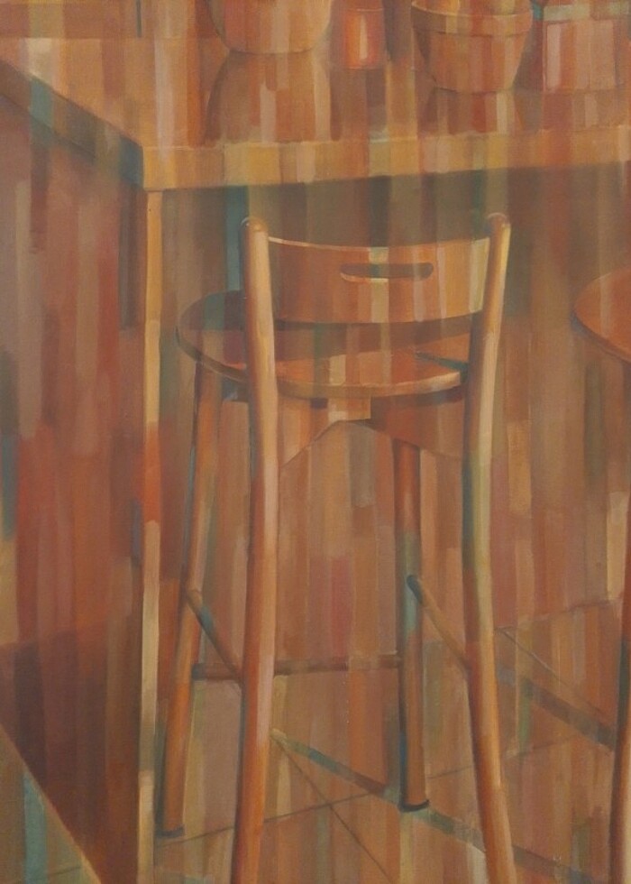 Ressam Nadir Cem'in uzun bacaklı sandalye isimli yağlıboya tablosu 110/65 cm boyutlarında